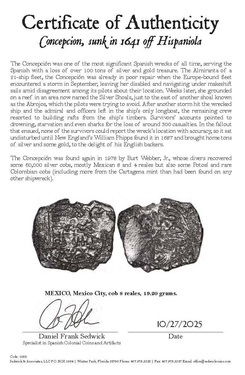 Concepcion Shipwreck (1641) MEXICO Mexico City Silver Cob 8 Reales with COA 1052