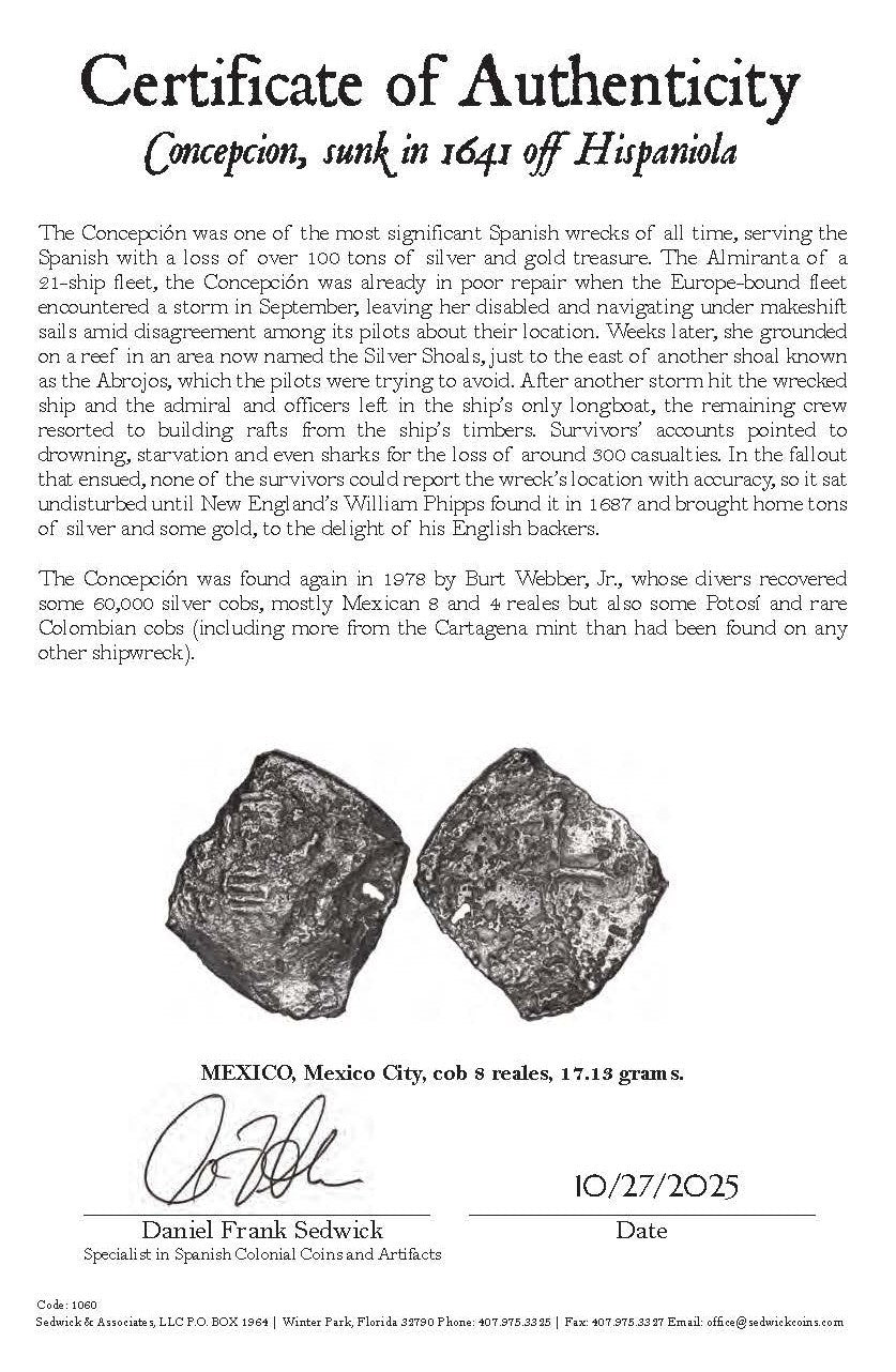 Concepcion Shipwreck (1641) MEXICO Mexico City Silver Cob 8 Reales with COA 1060