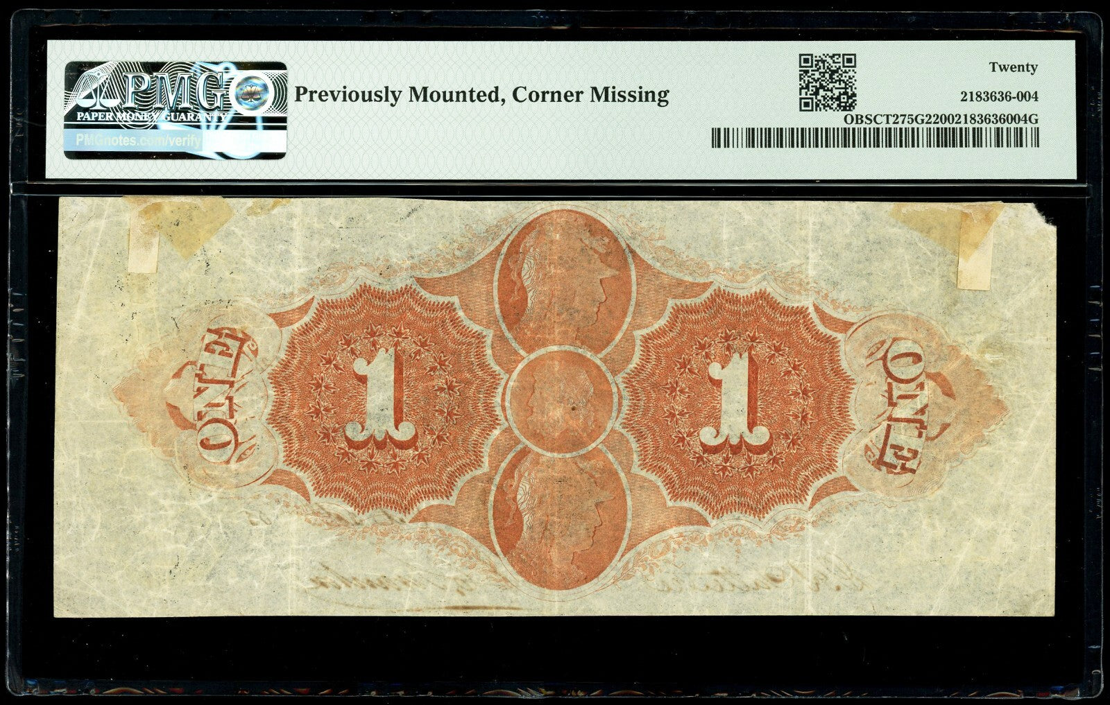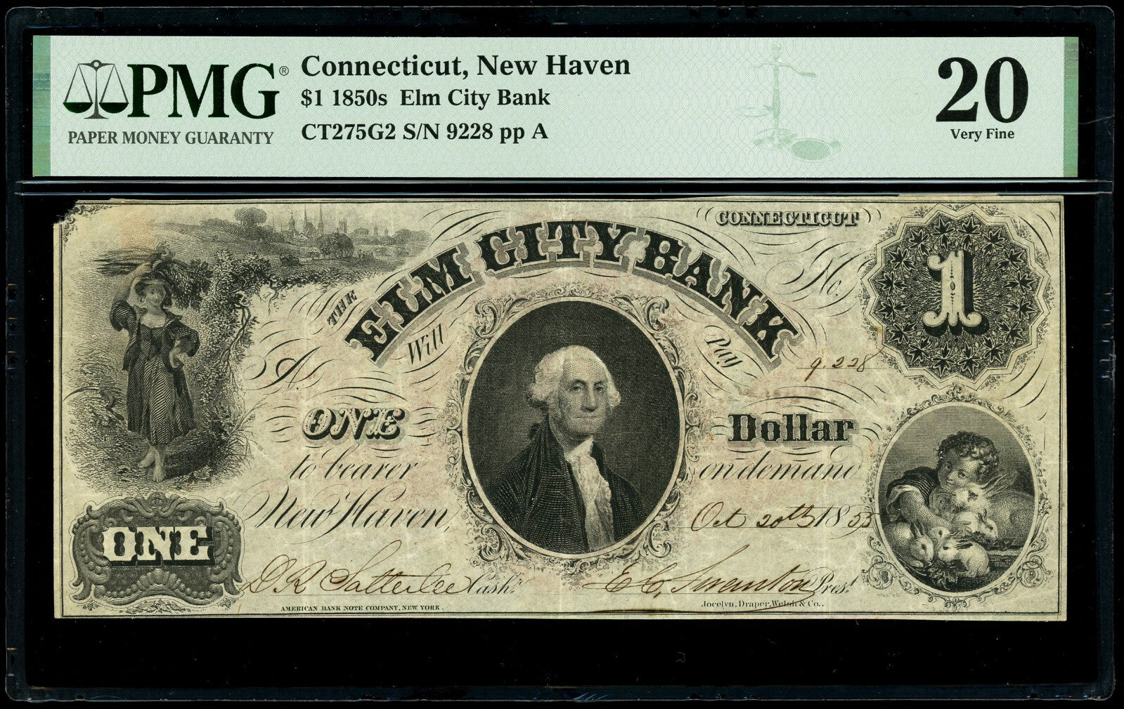 Haxby-CT275C2. A very rare note in any form; a status only reinforced by Haxby stating, "Surviving Example Not Confirmed." The Elm City Bank of New Haven became the Second National Bank of New Haven in 1864; redemption of the Elm City Bank notes, in addition to usual loss or destruction, resulted in this important obsolete rarity. VF with bold signatures and serial, upper left corner missing, mounting remnants on the back. (PMG #2183636-004)