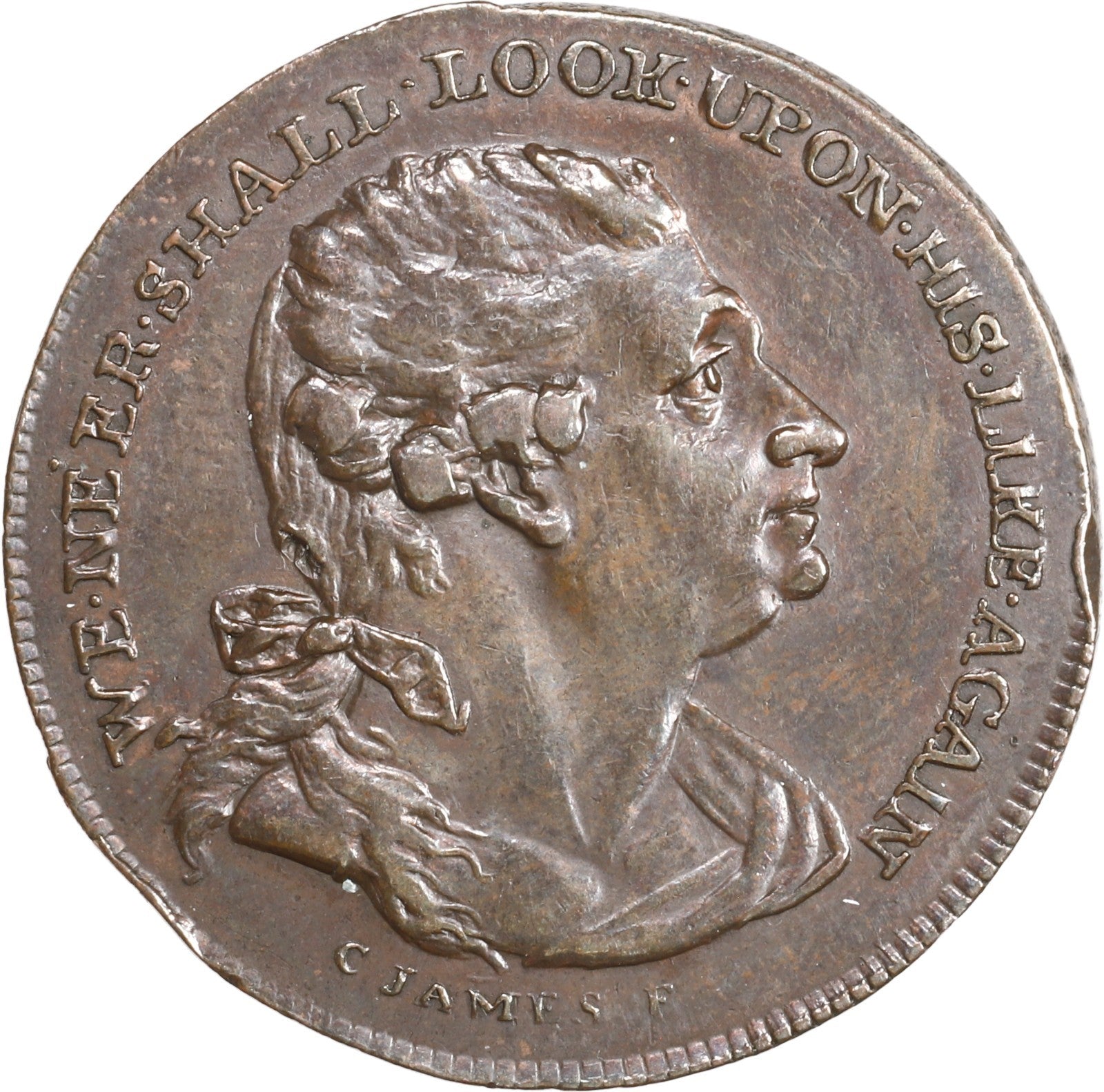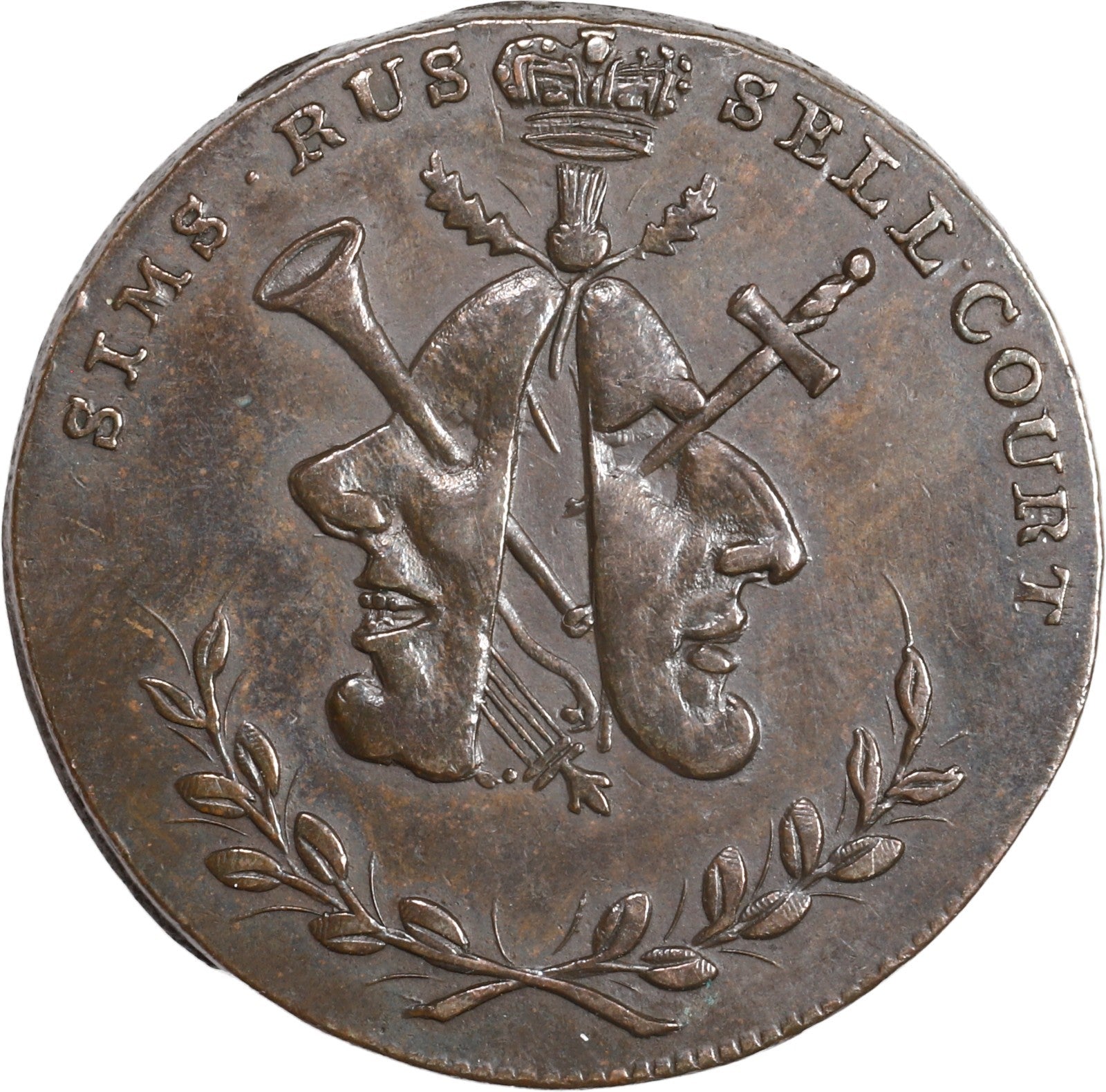 GREAT BRITAIN, Middlesex, copper halfpenny token, ca. 1790, Sims / Russell Court / Garrick, by C. James.