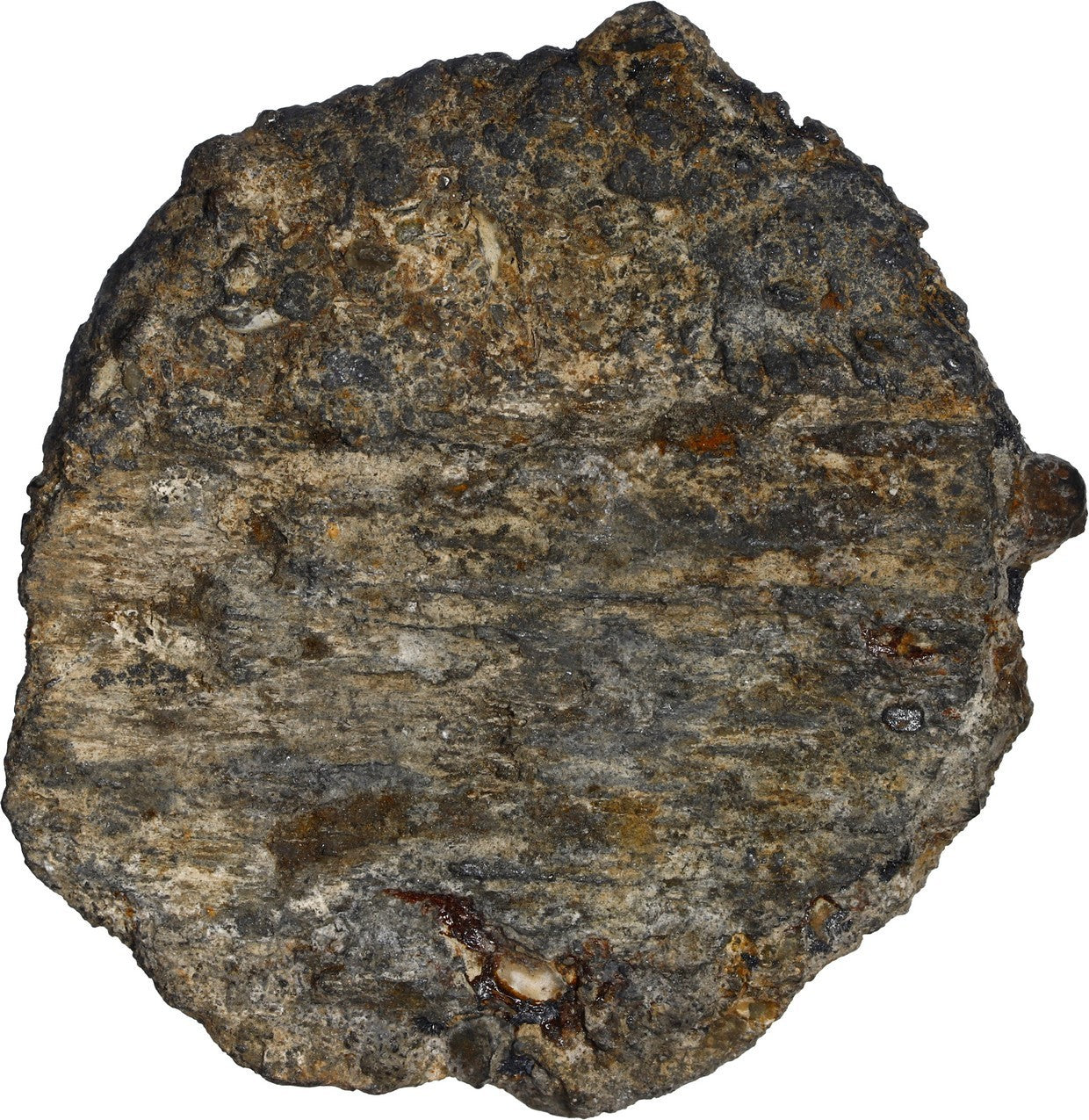 55.23 grams total. roughly 2" x ¼". Thickly encrusted biscuit with interesting streaky appearance on one side.