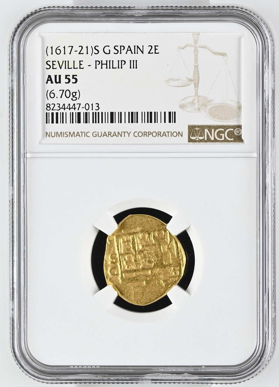 SPAIN, Seville, gold cob 2 escudos, Philip III, assayer G, NGC AU 55.