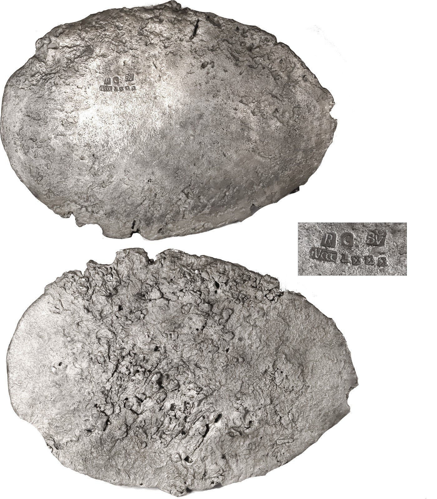 Large oval "tumbaga" silver ingot M-157, 24.99 lb av, marked with fineness IVCCCLXXX (1380/2400 fine), assayer B~Vo, serial RC, and one partial tax stamp, ex-"Tumbaga Wreck" (ca. 1528), García-Barneche Plate.